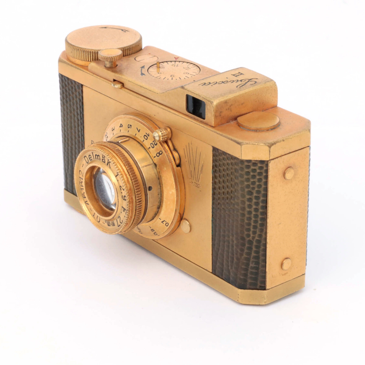 La Luxia II Oro è una fotocamera compatta e raffinata prodotta in Italia alla fine degli anni ’40 dalla COMI (Costruzioni Ottico Meccaniche Italiane) di Roma. Si distingue per la sua elegante finitura dorata e la copertura in pelle marrone, che la rendono particolarmente apprezzata dai collezionisti di fotocamere vintage.