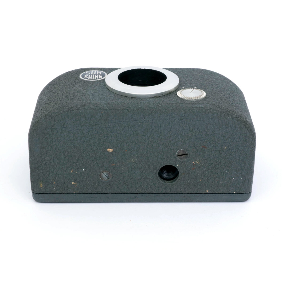 Questo primo modello, indicato come Sunshine I, rappresenta una versione di inizio produzione, priva di numero di serie. A differenza dei modelli successivi che presentano indicazioni incise sulla ghiera dell’obiettivo, questo esemplare si distingue per avere la ghiera ottica ancora vergine, senza scritte né numerazioni. Un dettaglio che lo rende particolarmente raro e interessante per i collezionisti.